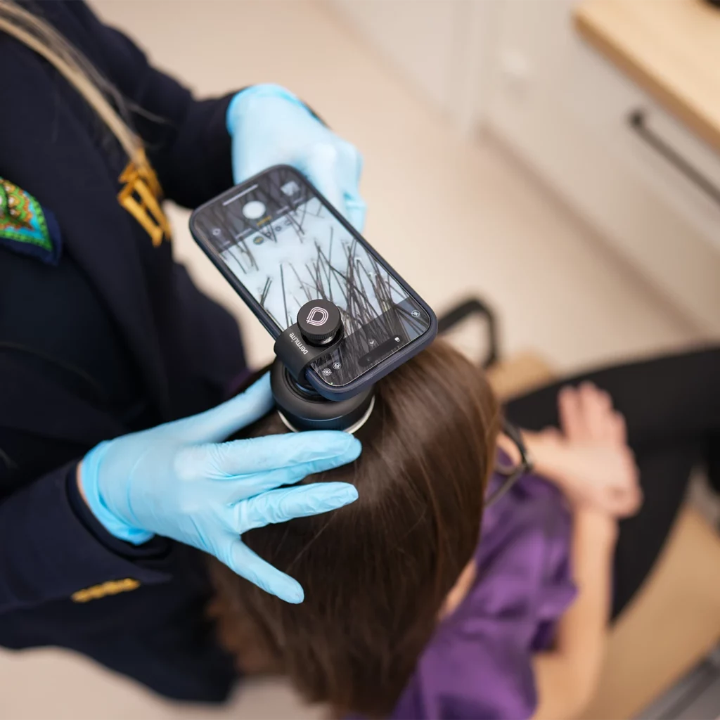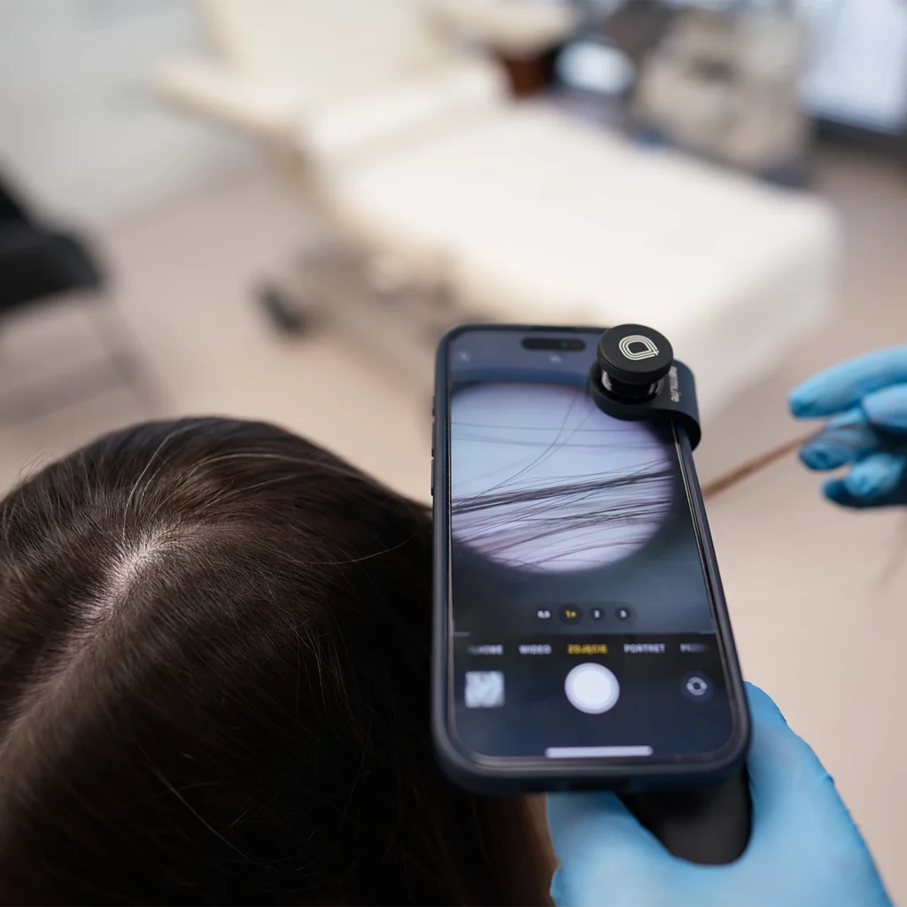 - Unikaj stosowania stylizatorów (lakieru, gumy, suchego szamponu), które mogą zaburzyć obraz trichoskopowy.