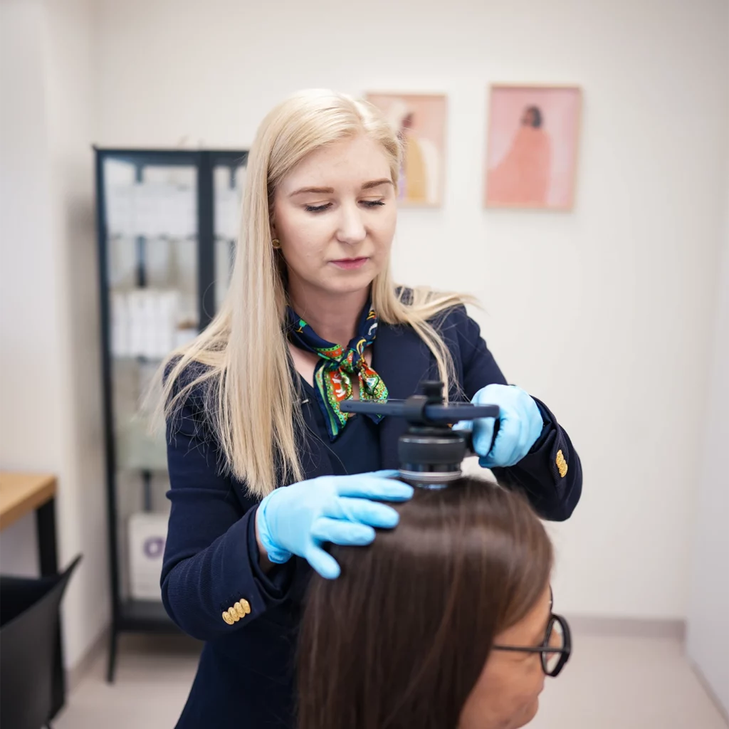 - Plan suplementacyjny (jeśli wskazany) – opracowanie programu wspomagającego zdrowie skóry i włosów poprzez odpowiednio dobraną suplementację.