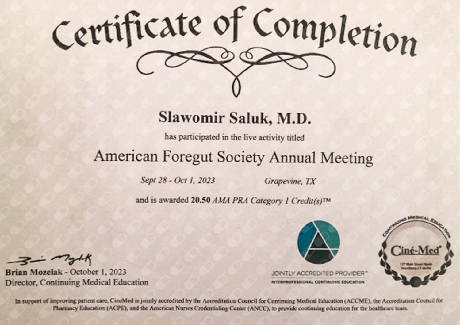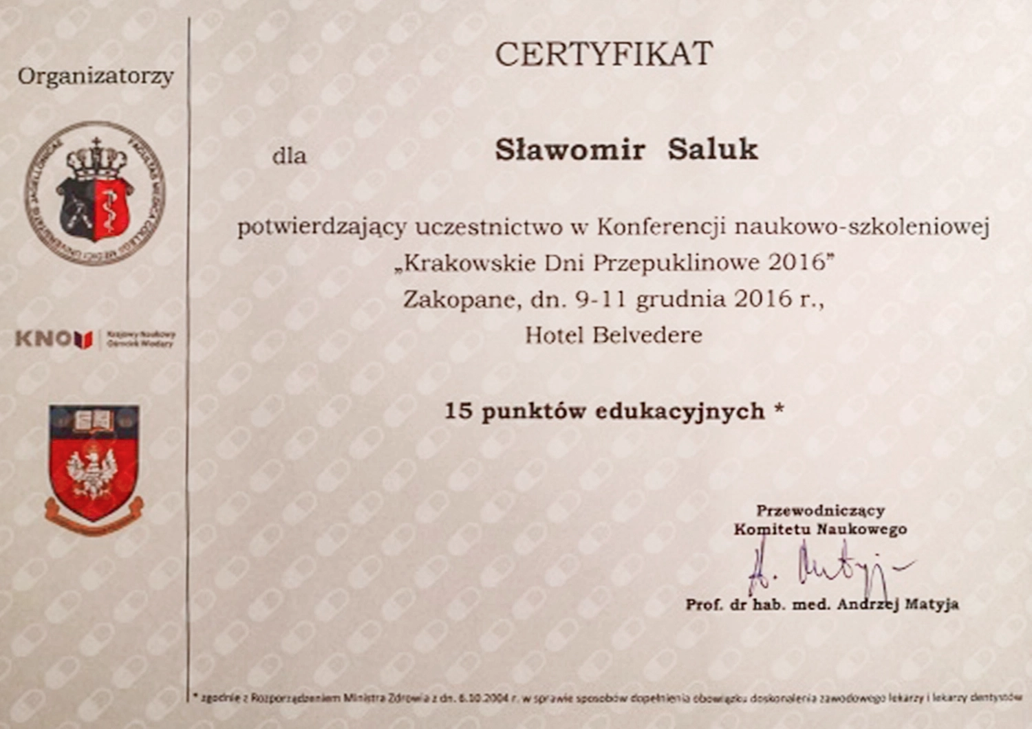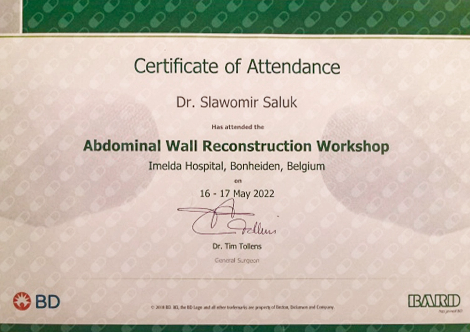 Lek. Sławomir Saluk jest wykwalifikowanym specjalistą chirurgii ogólnej, absolwentem Wydziału Lekarskiego Gdańskiego Uniwersytetu Medycznego. Swoje doświadczenie zdobywał, pracując w Klinice Chirurgii Ogólnej i Małoinwazyjnej w Miejskim Szpitalu Zespolonym w Olsztynie, a obecnie kontynuuje swoją praktykę w Szpitalu Powiatowym w Kartuzach, w jednym z najlepszych ośrodków antyrefluksowych w Polsce. Oprócz pracy klinicznej, angażuje się także w działalność naukowo-dydaktyczną na Uniwersytecie Warmińsko-Mazurskim, gdzie prowadzi zajęcia ze studentami medycyny oraz szkolenia z zakresu chirurgii przepuklin i zabiegów antyrefluksowych dla chirurgów z całego kraju. Jako jedyny polski chirurg jest członkiem prestiżowych organizacji American Foregut Society i European Foregut Society, zajmujących się chorobami górnego odcinka przewodu pokarmowego.