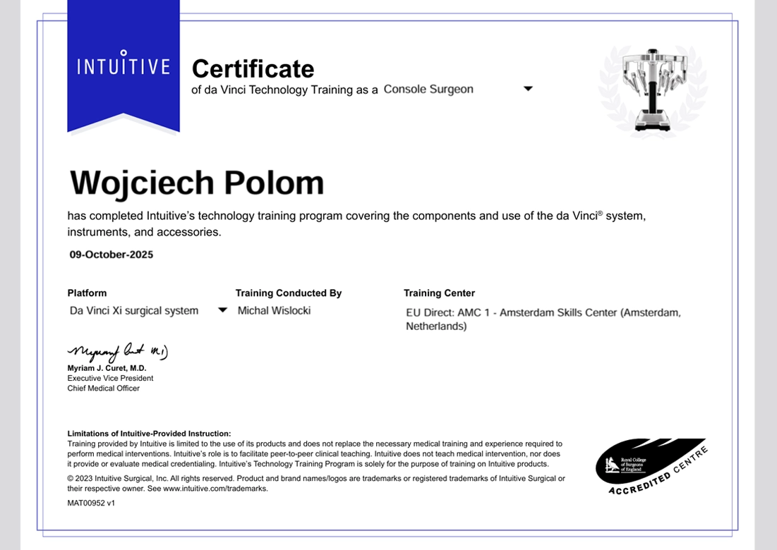 Doktor Wojciech Połom kontynuował rozwijanie swoich umiejętności, zdobywając certyfikat chirurga robotowego w 2022 roku. Jest aktywnym członkiem Polskiego Towarzystwa Urologicznego (PTU), Europejskiego Towarzystwa Urologicznego (EAU) i Europejskiego Towarzystwa Chirurgów Onkologicznych (ESSO).